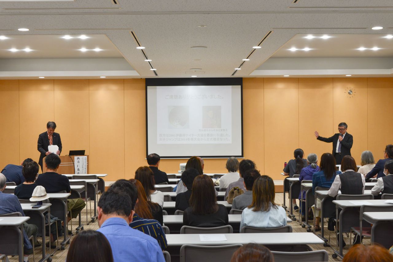 今回は本会の公益事業として歯科分野に特化せず、創立20周年記念事業市民公開講座の講師として1994年リレハンメルオリンピック銀メダリスト、スキージャンプの西方仁也氏をお迎えしました。講演会ではご自身のスキージャンプ競技のキャリアの紹介の中におけるアスリートとしての歯科的分野との関わり。また競技人生最大のピークであるリレハンメルと、テストジャンパーとして参加した長野の両オリンピックにおけるチーム戦で、銀メダル、金メダルの背景にある多くの人間模様。そしてその長野オリンピックでの大逆転の実話を映画化し、本人が主人公のモデルとして多くの感動を呼んだ映画「ヒノマルソウル」の制作秘話まで、熱のこもった内容となりました。おかげさまで約80名近い参加者で、オリンピックイヤーともあいなって関心の高さが伺えました。