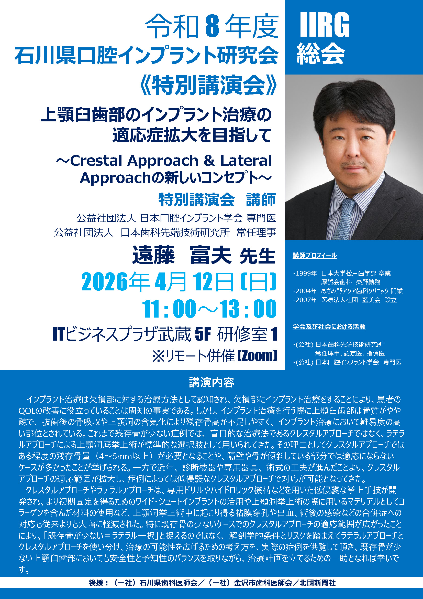 2026年4月12日(日)石川県口腔インプラント研究会総会・特別講演会